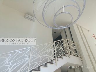 Абстрактные линии создают узор в каждом пролете, причем линия не обрывается полностью никогда: ни на первом этаже, ни на втором. Единая композиция складывается по всему пролету лестницы, обеспечивая конечную полную картину по всему периметру