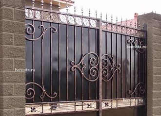 По центру воротин проходит нащельник, который необходим для того, чтобы скрыть щель между створками. Верх ворот украшен декоративными пиками.